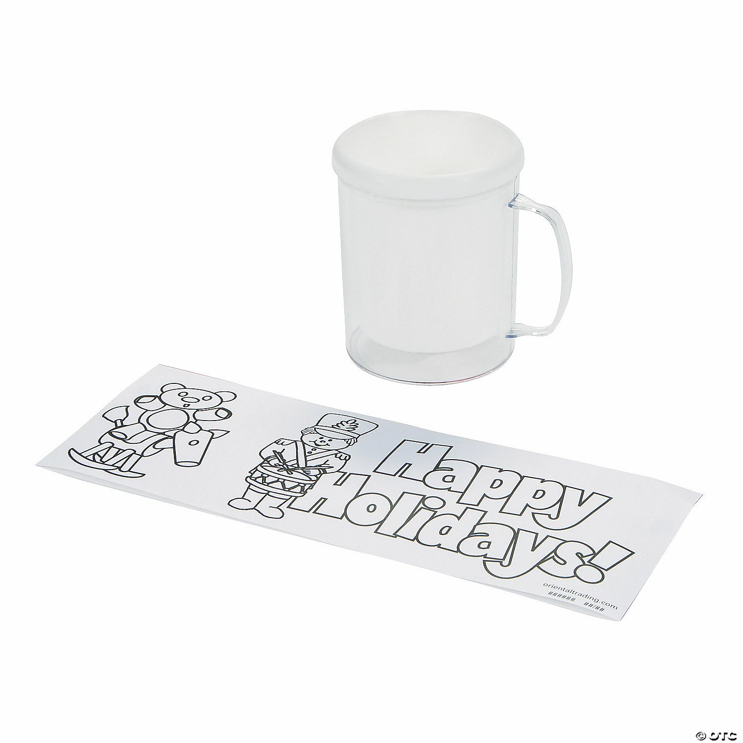 Color Your Own Holiday Mugs. Kids love adding their own creative color to these festive mugs! These cute coffee cups make a fun and easy art project for preschool or day care students. Each plastic mug includes 1 paper “Happy Holidays” insert. Pulls apart and snaps closed easily. A thoughtful Christmas gift for Mom or Dad! 8 oz. Remove insert before washing. ยฉ OTC