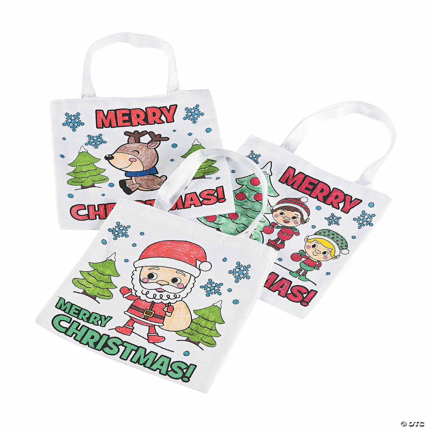 Customize your own winter bag. These DIY mini tote bags are fun activities for adults and children! Color them in as a creative winter art project and use them to carry your Christmas loot home, or stuff them with tissue paper, candy and presents and give them out as gift bags. Cotton. 8 1/2″ x 8 1/2″ with 5″ handles. ยฉ OTC