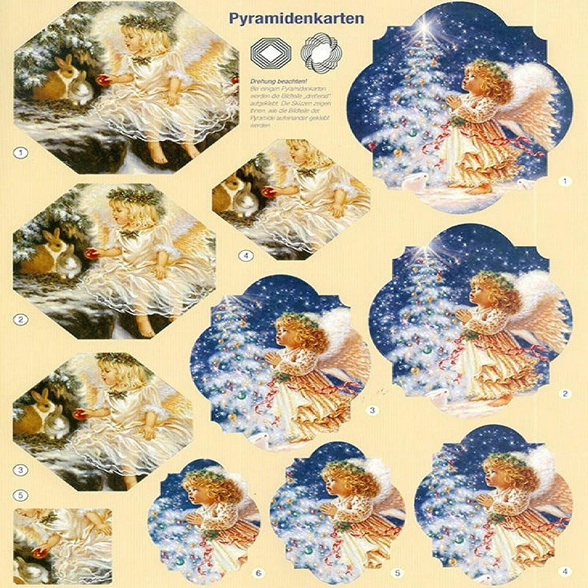 Precut 3D Pyramid -Angels with Tree & Little Sheppard These pyramid sheets are very beautiful, they come with 2 different sheets per package with 2 separate images on each. Each image has a unique shape and are put together by twisting slightly. Wonderful for cards or scrapbook pages, easy to create, simply press out and layer with foam tabs or 3d glue according to numbers.